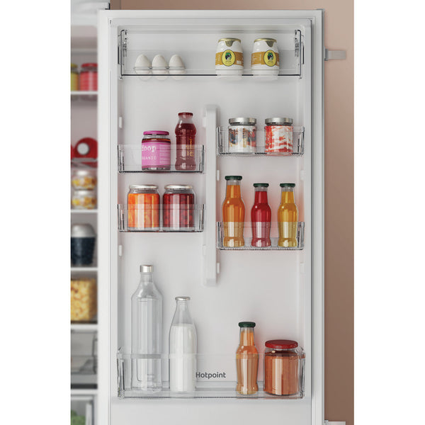 This Hotpoint built in 70/30 Fridge Freezer features: a tall appliance to fit your family needs. White colour. Glass shelves, providing robustness. A fan that provides a smooth and even flow of air in your appliance for enhanced ventilation. Convenient bottle balcony to safely store your bottles.