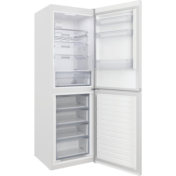 This 60cm Wide 186cm Tall 50/50 Split Hotpoint freestanding Fridge Freezer features: a tall appliance to fit your family needs. White colour. No frost, frost free technology, that effectively prevents ice build-up in your appliance, by reducing humidity levels. Glass shelves, providing robustness. A fan that provides a smooth and even flow of air in your appliance's cavity, for enhanced ventilation.